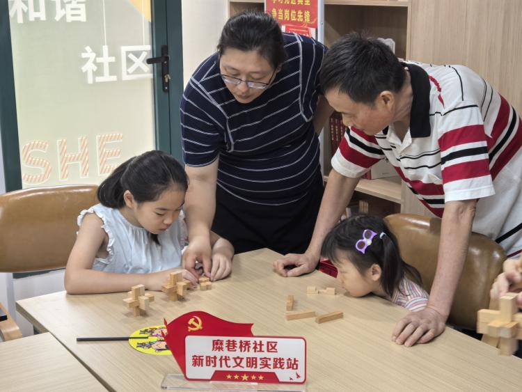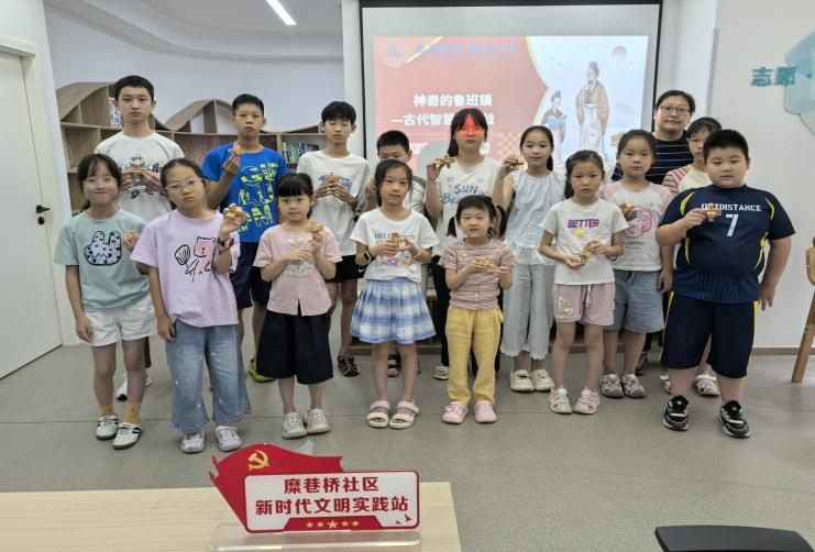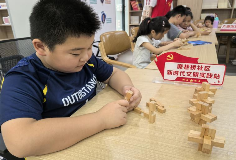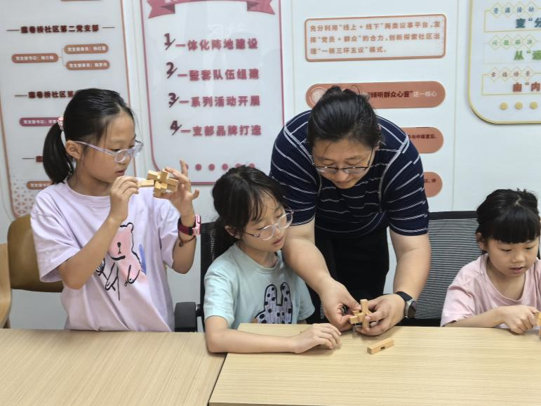 “小朋友们看仔细啦,这根木条要从这里穿过去,对准凹槽轻轻一推……”7 月 22 日上午,糜桥巷社区活动中心里传来阵阵欢笑声,来自无锡职业技术大学机械工程学院党总支学生二支部党员教师周丽正带领15 余名社区小朋友解锁 “鲁班锁” 的奥秘,一场别开生面的传统文化科普活动在此展开。