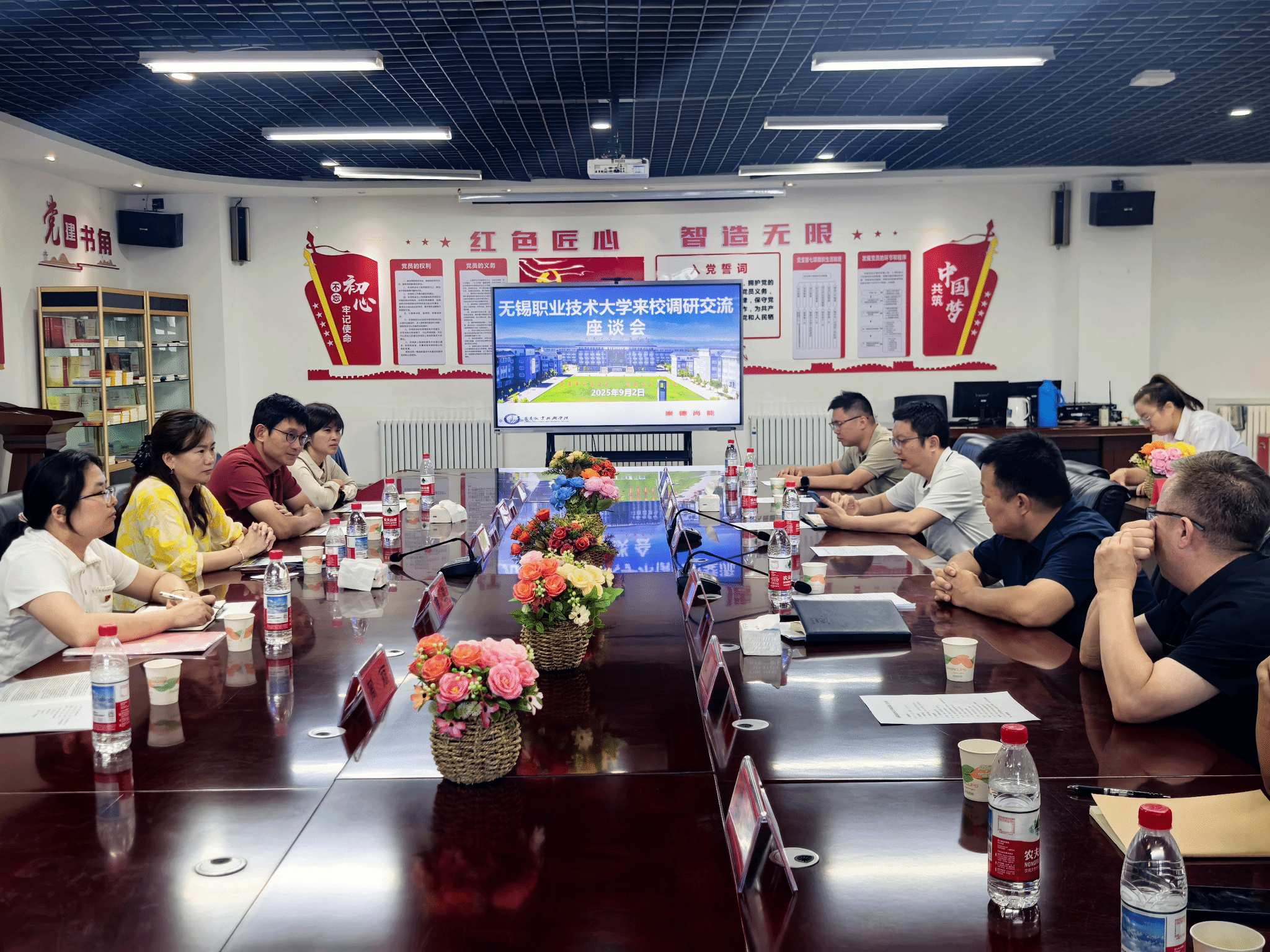 9月2日,王丽梅副书记一行赴昌吉职业技术学院继续开展党建共建活动。在该校机电工程学院副书记、副院长黄永东等人陪同下,曹澍副院长一行参观了校史馆和国家级实训基地,了解其办学历史与实训资源建设情况。期间,王丽梅副书记以《职业院校辅导员工作品牌建设——辅导员与学生共成长》为题作专题报告,结合江苏省高校首批辅导员名师工作室“梅姐驿路”的实践案例,分享如何通过品牌建设提升育人能力。在党建共建签约仪式暨座谈会上,昌吉职业技术学院机电工程学院党支部书记赵建文介绍了学院在党组织建设、专业群发展、师资队伍建设及服务地方产业等方面的成效,期待以共建为契机强化东西部联动。随后,双方签署党建共建协议,明确围绕组织建设互促、党员队伍互动、专业发展互联等维度开展合作,打造党建与业务双融双促典范。
