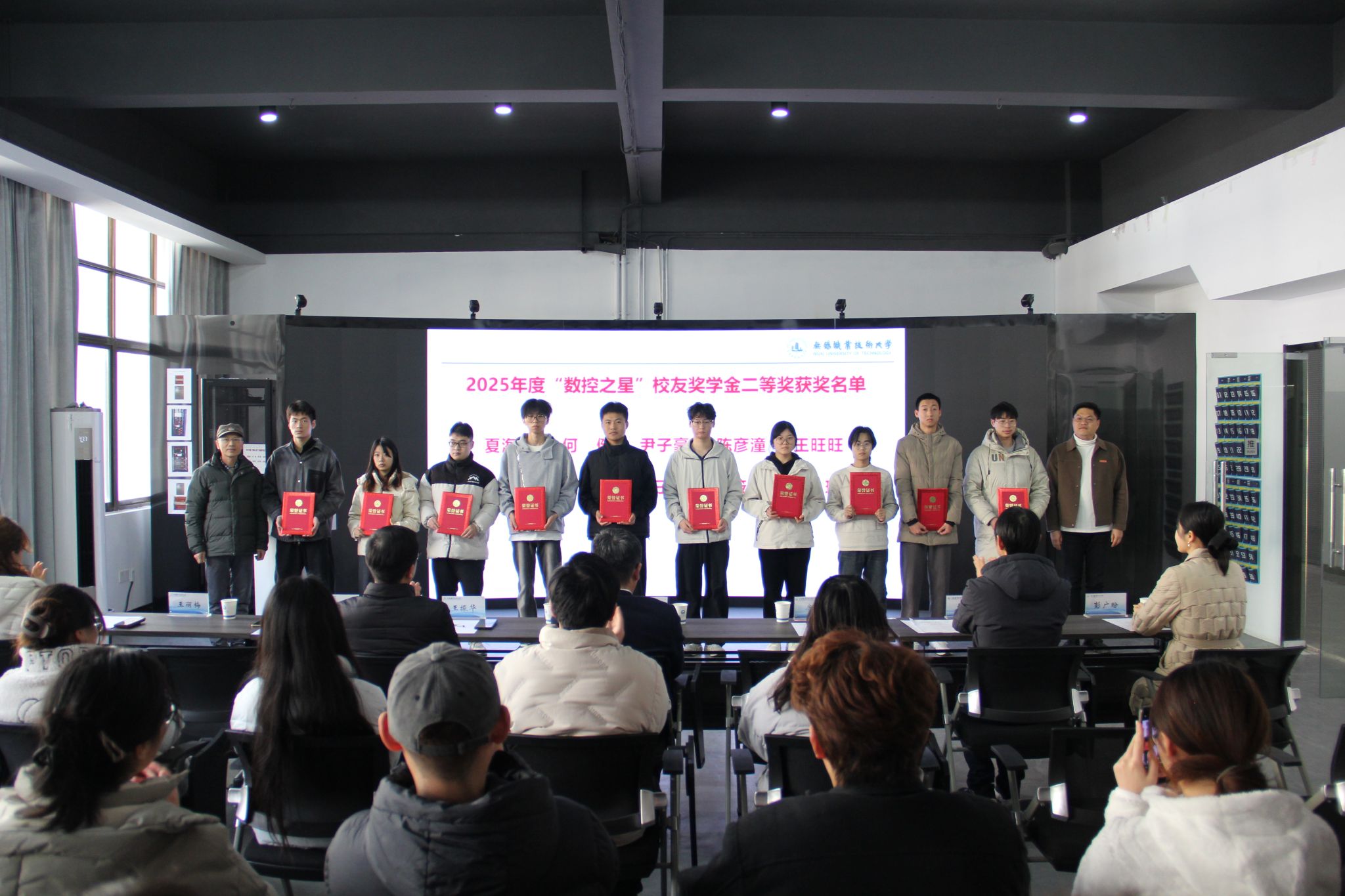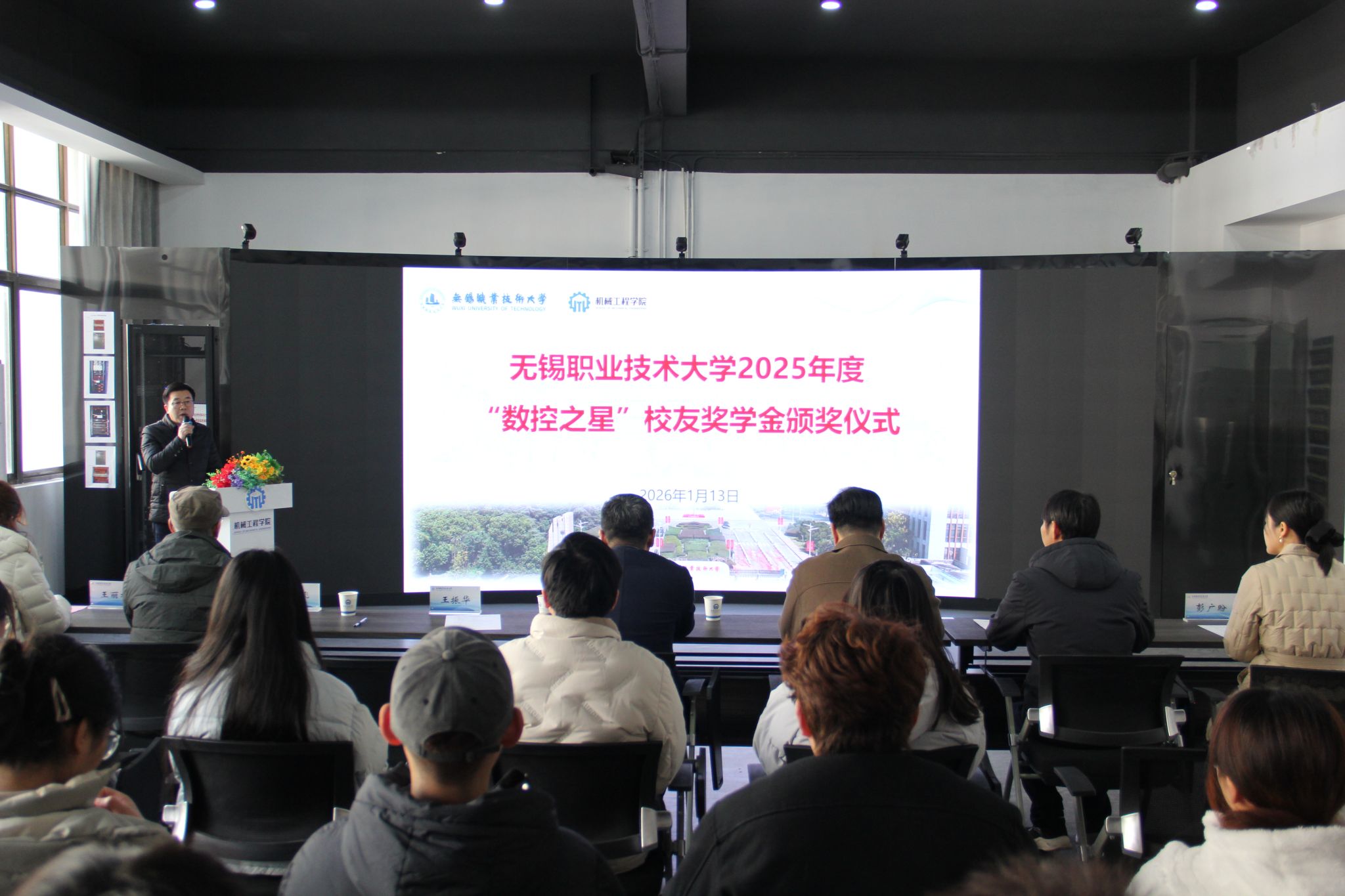 1月13日下午,无锡职业技术大学2025年度“数控之星”校友奖学金颁奖仪式在机械工程学院S208会议室温情启幕。校党委委员、副校长储开峰,校关工委秘书长周陆飞,校招就处、校友办处长房磊,校党委学生工作部副部长徐锋,机械工程学院相关负责人及全体获奖学生齐聚一堂,共同见证这份满载荣光的颁奖时刻。