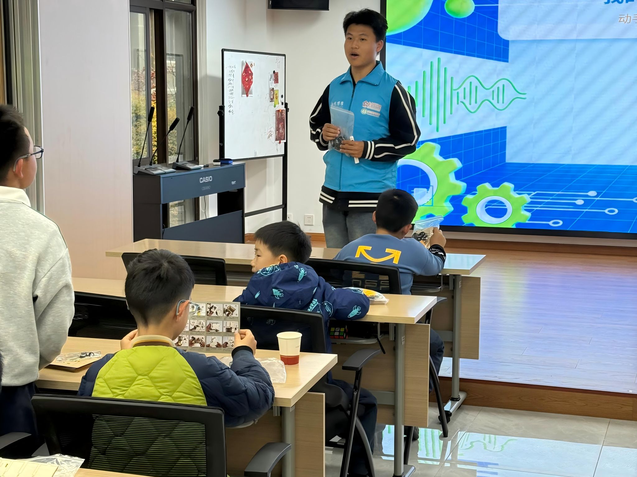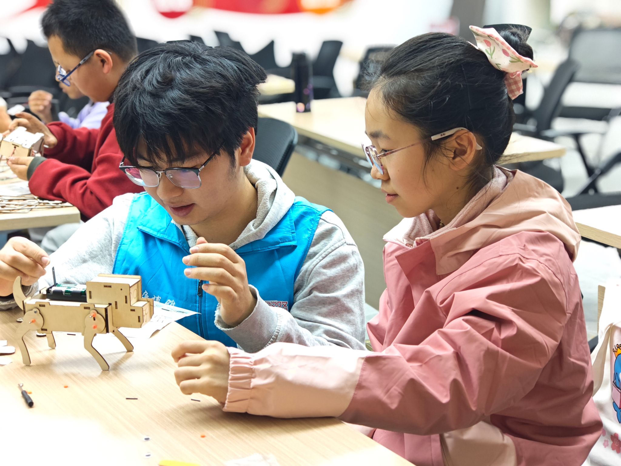本次春假科普志愿服务活动精心设计了趣味实践课程,循序渐进引导孩子们走进智能科技世界。《走进AI世界:智能机器狗趣味课堂》将智能机器狗的组装过程巧妙设计成“探险之旅”式的游戏化体验。孩子们化身为小小“AI工程师”,通过亲手拼装一只活泼可爱的智能机器狗,来“解锁”科技的秘密。志愿者在讲解时采用故事化的语言,例如把电机比作“机器狗的心脏”、传感器比作“聪明的大脑”、线路比作“神经系统”,让抽象的科技概念变得生动形象、易于理解。《小小工程师:声控机器人拼装课》则在此基础上进一步升级。志愿者把声音传感器比作“机器人的耳朵”,将声音信号转化为电信号的过程生动比作“把听到的指令翻译成机器人能懂的语言”。课程不再局限于单纯的机械拼装,而是将声学、电子学、编程逻辑与机械工程有机融合,帮助孩子们直观感受到现代智能科技的综合性与系统性,在快乐的实践过程中为未来学习人工智能、机器人工程等前沿领域埋下了坚实的兴趣基础。
