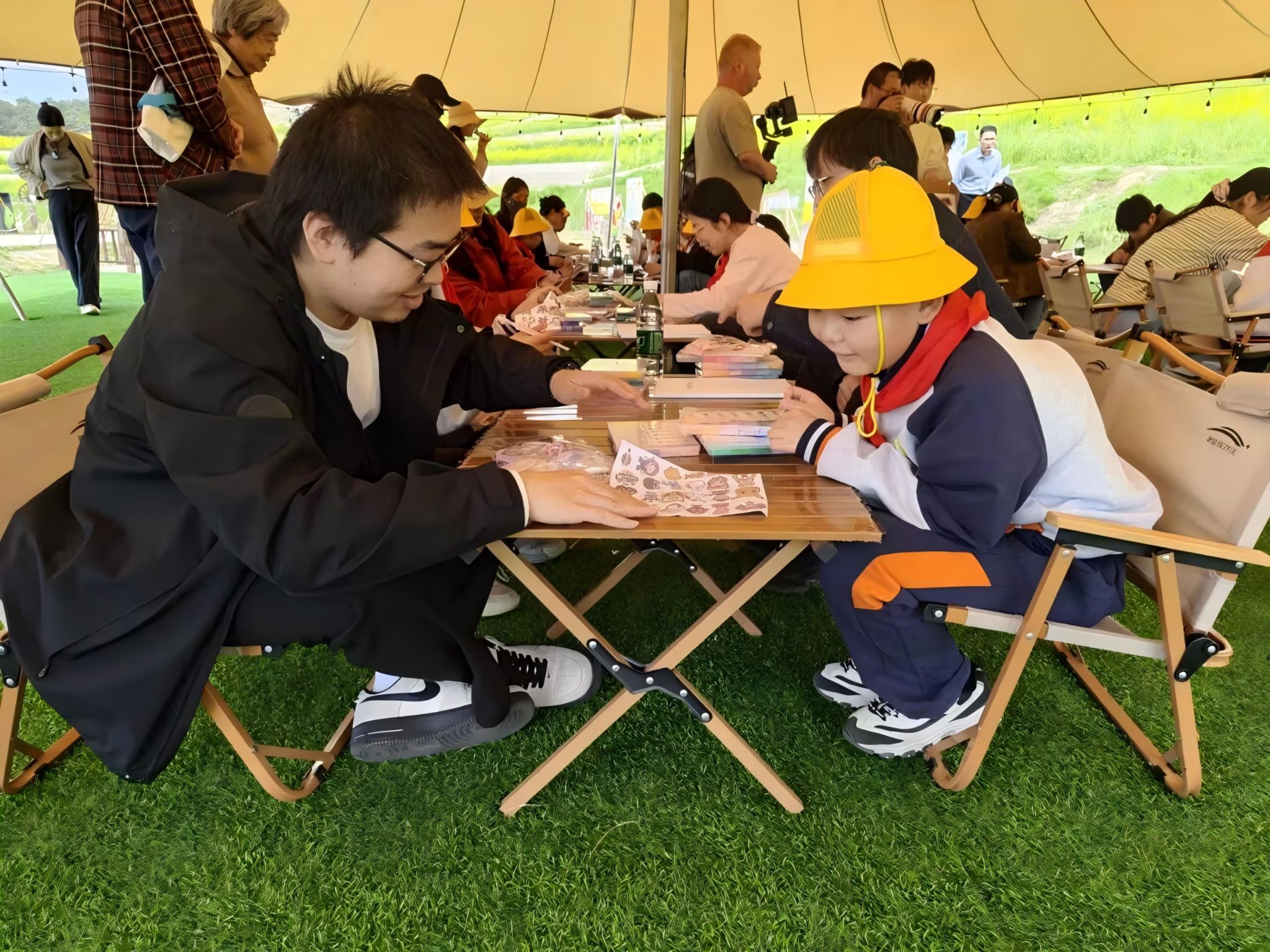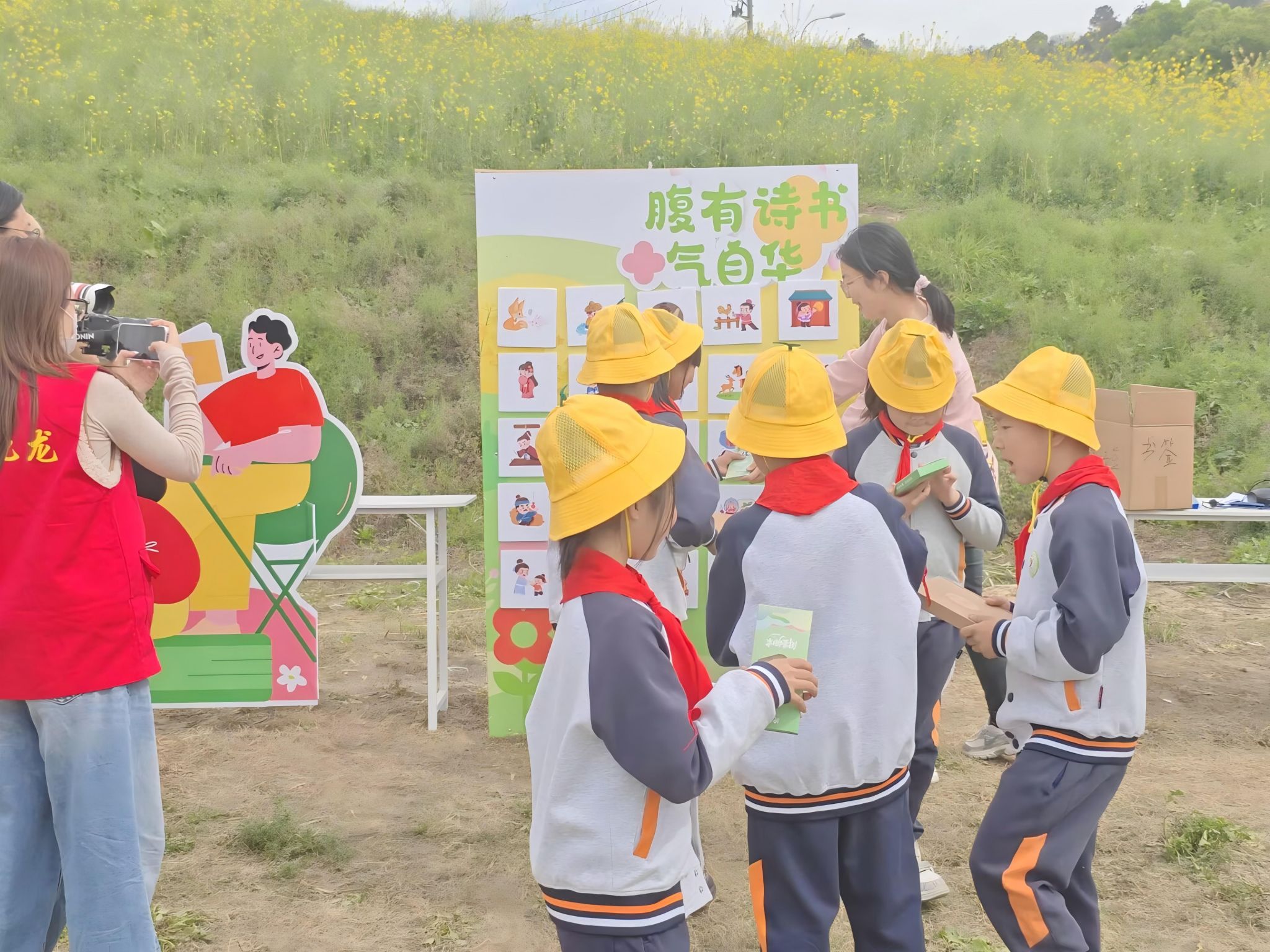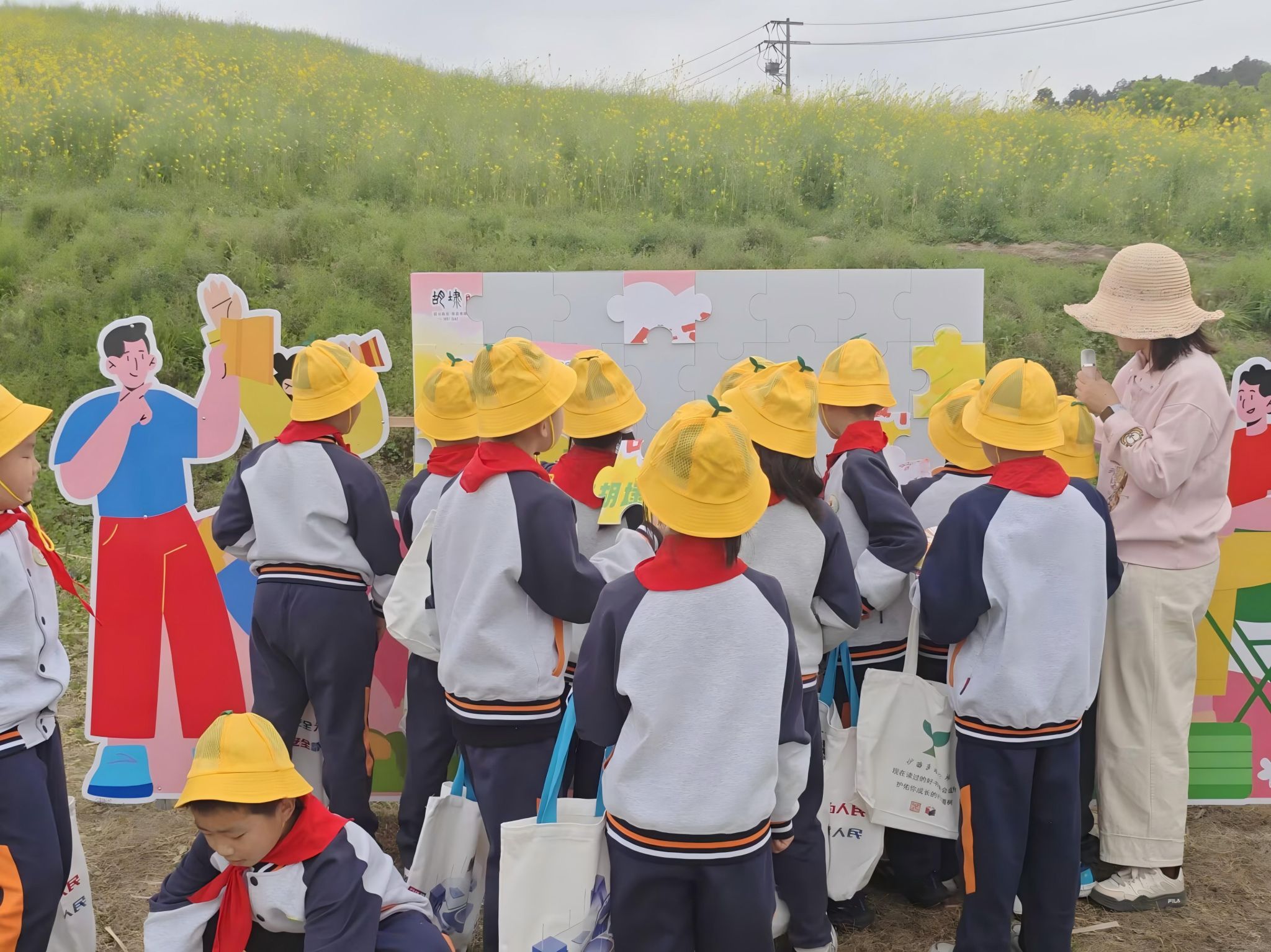 花海走读环节中,我院学生陪同小朋友们一同参观主题画展及 “状元里” 乡风文明实践带画展,让孩子们在自然与艺术的交融中,感受家乡深厚的文化底蕴。田埂之上,书香与春风相伴,诗意盎然。结合我校第二十届读者节的文化内涵,同学们还带领小朋友开展了主题拼图、“腹有诗书气自华” 趣味打卡等田埂诵读互动,在轻松有趣的游戏中引导孩子们诵读经典、品味诗词之美,让全年龄共读的浓厚书香氛围弥漫在整片花田间。在拼豆手作等创意实践区,大家一同以彩豆为媒、以创意为笔,创作专属春日作品。一件件精巧别致的手作,既是劳动与美育的生动实践,也成为春日里最温暖的成长纪念。