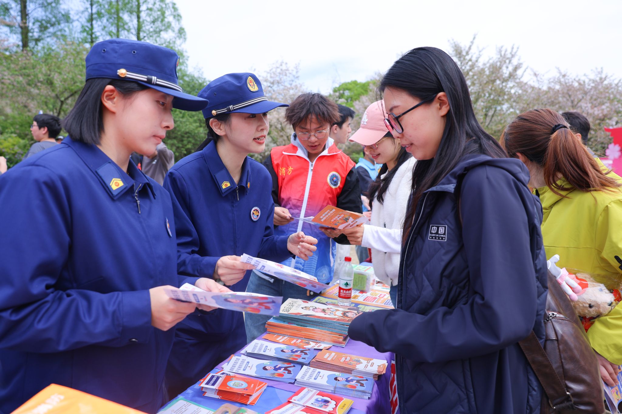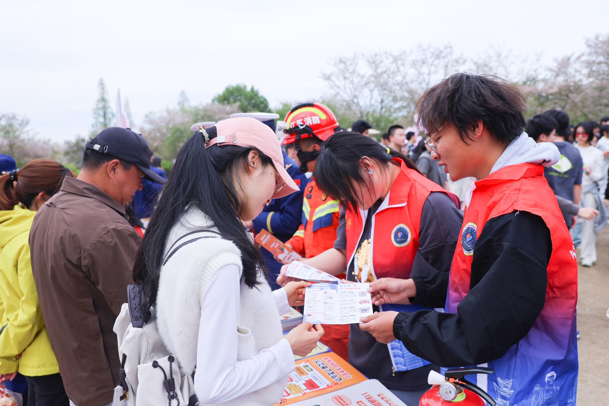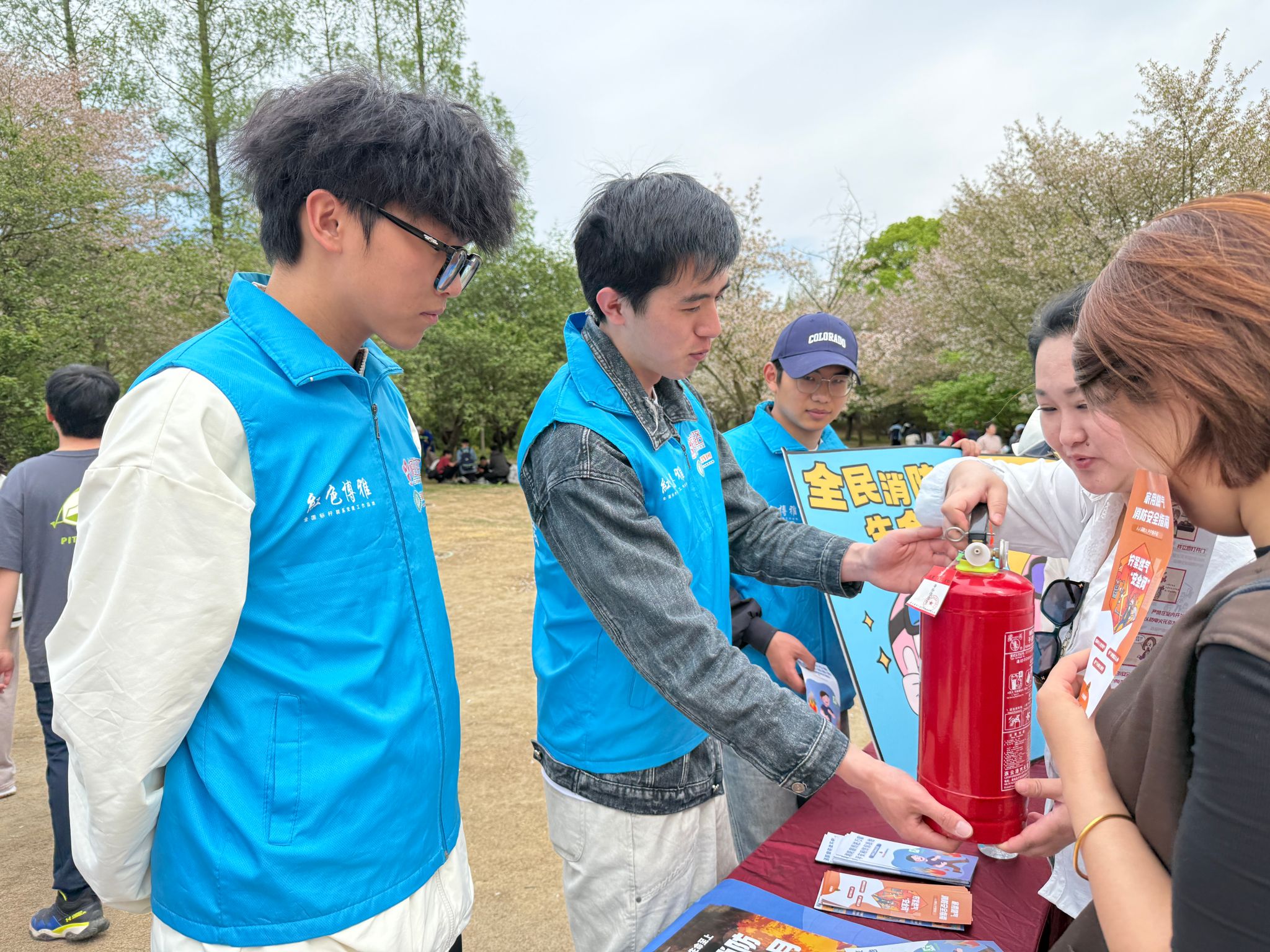活动期间,志愿者们全身心投入景区安全服务工作,分工协作、各司其职。在景区科普点位,志愿者们协助开展消防安全知识普及,耐心向过往游客讲解春季出游防火注意事项,现场示范灭火器、逃生面罩的正确使用方法,手把手指导游客实操演练,帮助大家掌握基础应急自救技能。同时,志愿者们沿着赏樱核心步道、林间休闲区开展常态化巡查,及时劝阻游客违规吸烟、乱扔火种等危险行为,排查周边消防安全隐患,提醒商户规范用电用火,筑牢景区安全防线。