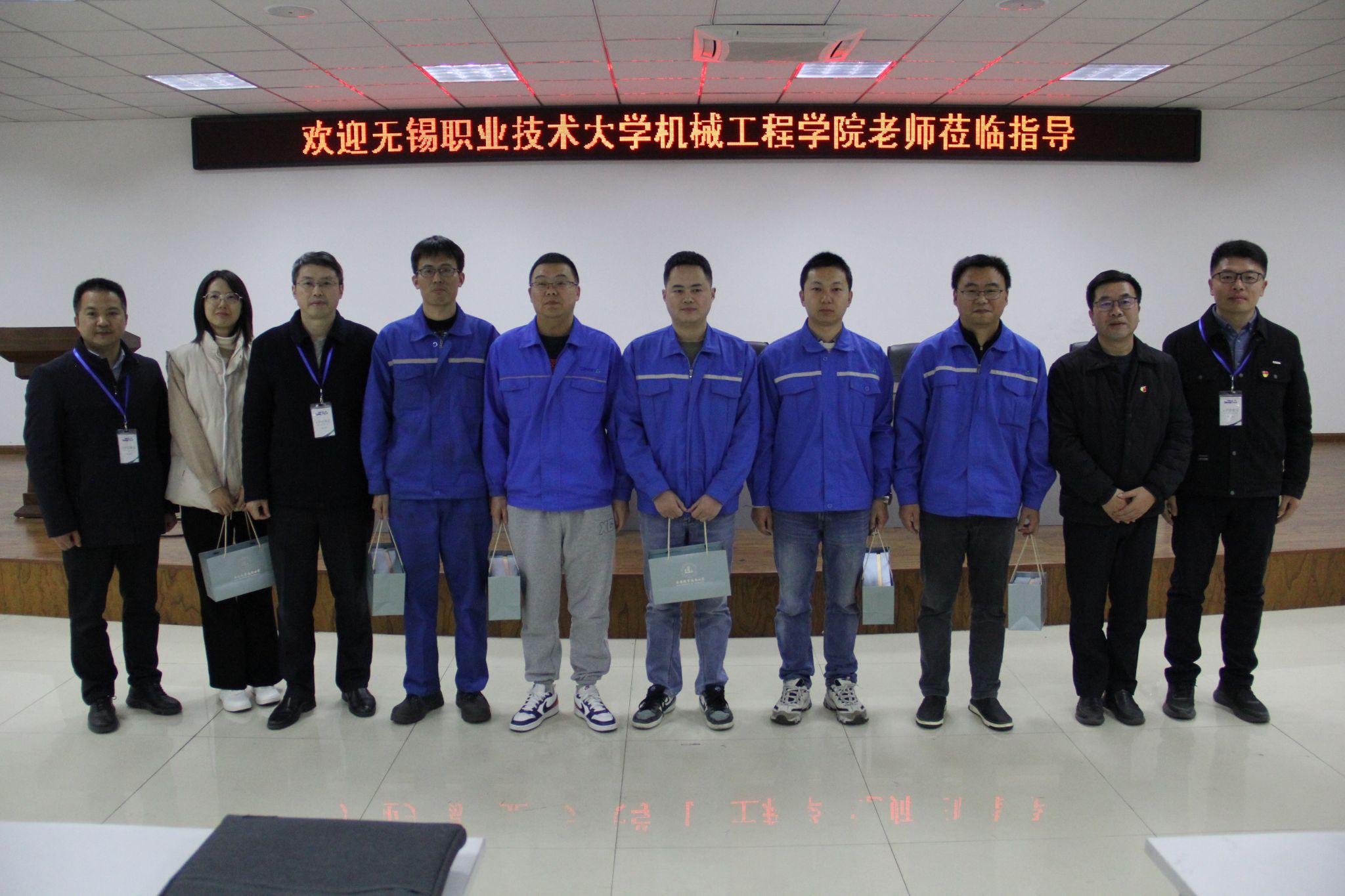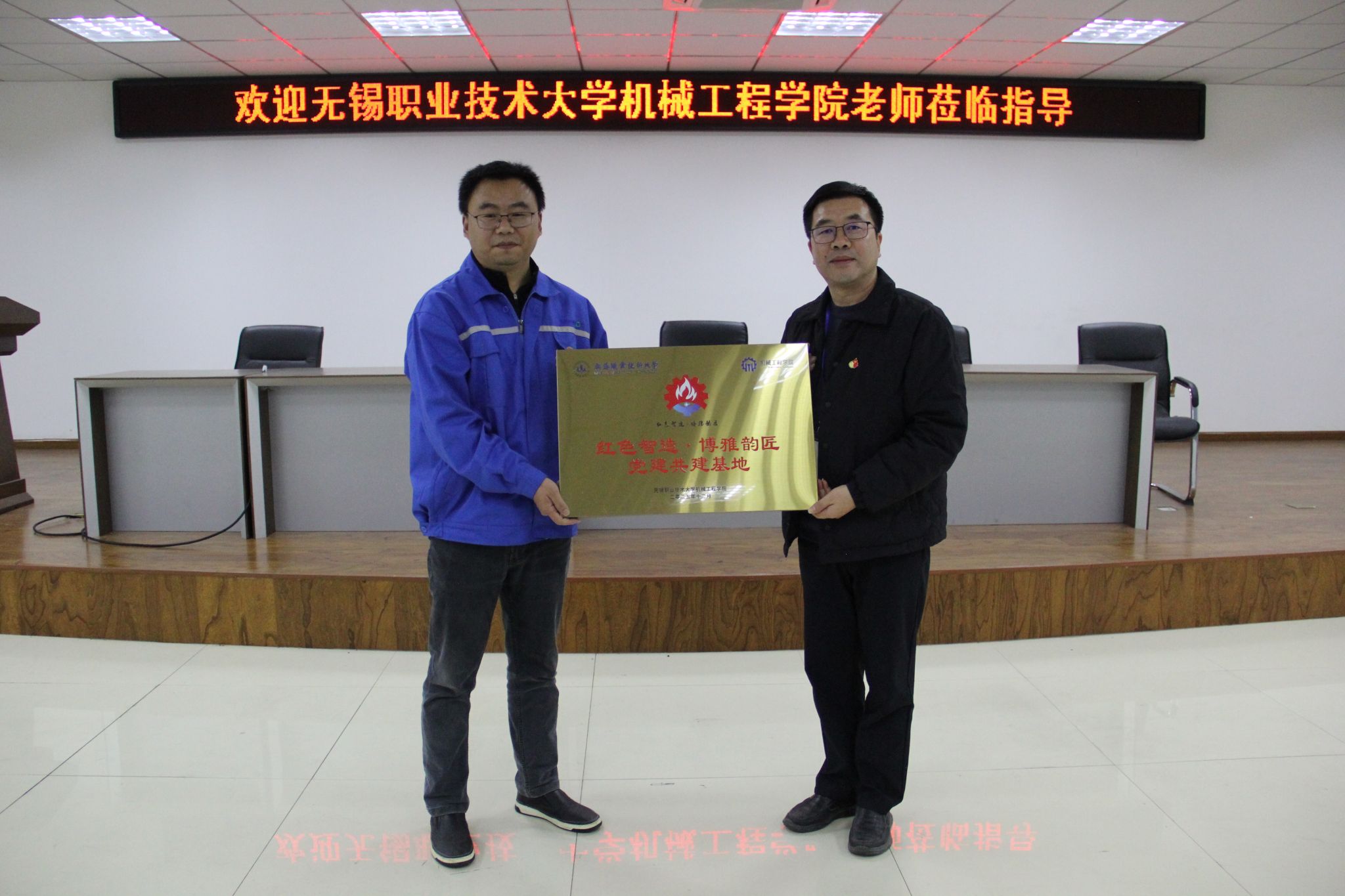 在江南大学江阴校区智能制造学院,党员一行参观了校园建设以及智能制造实验室,近距离观摩了先进制造装备与科研成果,直观感受了学科建设与技术创新的前沿动态。随后,两校院系党组织举行了党建共建签约仪式,无锡职业技术大学机械工程学院党总支书记王振华与江南大学智能制造学院党委书记王冰共同签署合作协议,为校校资源共享、优势互补奠定坚实基础。签约后,双方党组织联合开展了“党的二十届四中全会精神”专题学习会,现场交流氛围热烈,进一步凝聚了以党建引领教育教学高质量发展的思想共识。