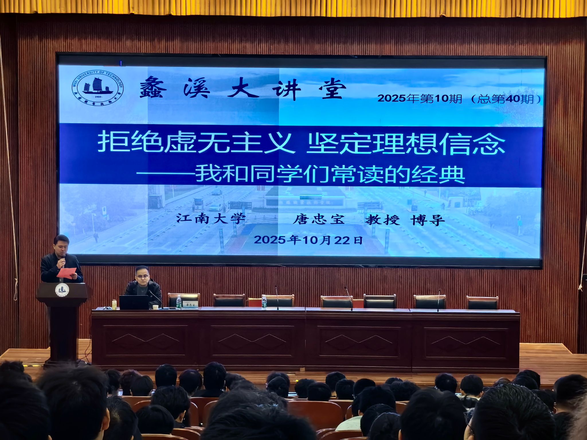 历史是青春的深厚土壤,也是照亮前行道路的明灯。为帮助青年大学生更快融入大学生活、筑牢信仰之基。10月22日晚,机械工程学院特邀江南大学马克思主义学院教授、博士生导师唐忠宝走进“蠡溪大讲堂”,为2025级全体本科生带来《拒绝虚无主义,坚定理想信念——我和同学们常读的经典》专题报告,本次活动由图书馆和机械工程学院联合举办,报告会由图书馆副馆长王东亮主持。