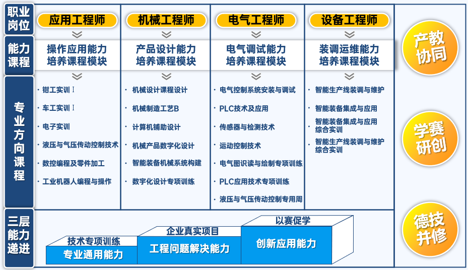 机电设备辅助设计、机电一体化设备安装调试、工业机器人操作与编程、智能装备系统集成与调试、智能产线调试与运维等。