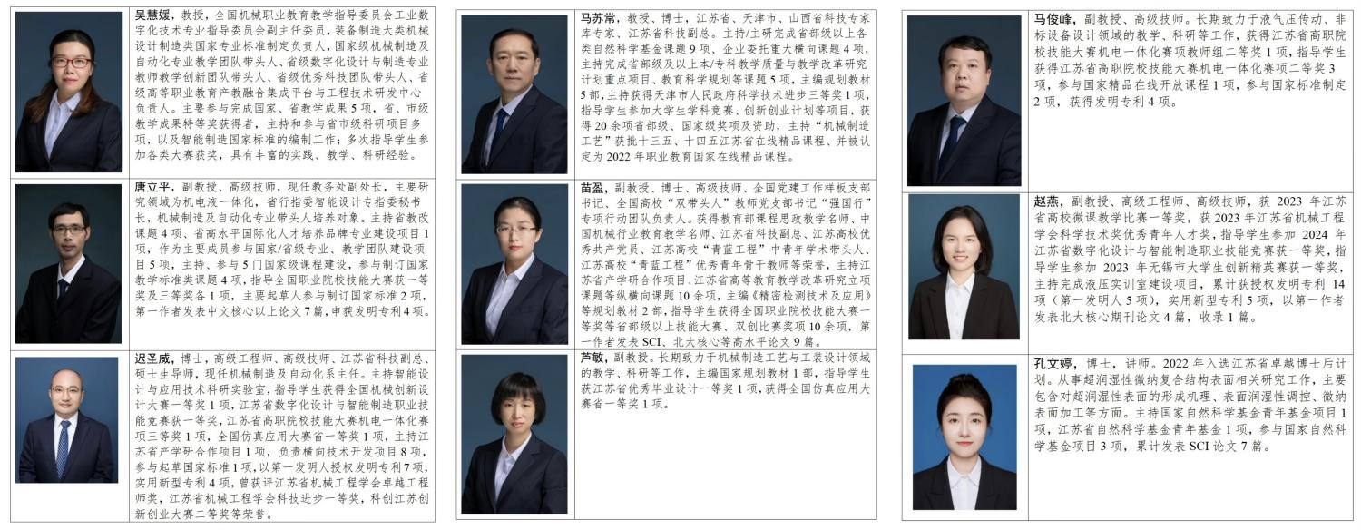 近几年,专业教师入选国家课程思政教学名师2人、江苏省“科技副总”7人、江苏省技术能手1人,江苏省“双创”博士1人、江苏省“产业教授”1人、江苏高校“青蓝工程”中青年学术带头人1人、江苏高校“青蓝工程”优秀青年骨干教师2人。系部教师团队主持国家自然科学基金1项,江苏省自然科学基金1项,江苏省产学研合作项目7项,完成企业技术开发服务项目30余项,完成专利与技术转化10余项。