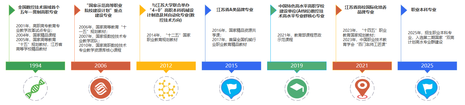 本专业依托的高职专科专业数控技术专业,先后入选2001年高职高专教育专业教学改革试点专业、2006年“国家示范高等职业院校建设计划”重点建设专业、2012年与江苏大学联合举办“4+0”高职本科机械设计制造及其自动化专业(数控技术方向)、2015年江苏省A类品牌专业、2019年中国特色高水平高职学校建设单位(A档校)数控技术高水平专业群核心专业、2021年江苏省高校国际化培养品牌专业,2025年再次入选国家高水平专业群核心专业,专业建设成果丰硕,基础良好。