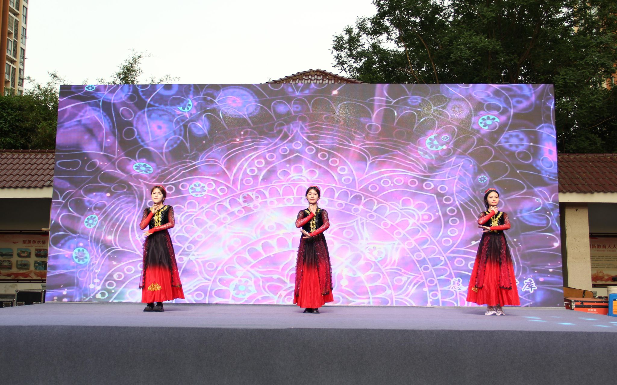 当晚5时30分,多民族文艺汇演在热烈氛围中开启。无锡职业技术学院学生凯迪日耶·艾合买提、阿依姆古丽·阿不都克然木、穆妮热·艾斯卡尔以一支充满生机的民族舞蹈《春之畅想》开场,形成跨越地域的文化共鸣。表演过程中,社区广场四周逐渐围满了驻足观看的居民,72 岁的退休教师李先生忍不住拿出手机录制视频:“你看这动作里既有民族舞的韵味,又有端午赛龙舟的意象,孩子们把传统文化编得这么活灵活现!”当舞蹈进入高潮,三位舞者手拉手围成石榴花造型时,台下爆发出持续的掌声与喝彩声。“我们想通过舞蹈展现各民族文化的魅力,让更多人感受团结的力量。”表演者阿依姆古丽说道。