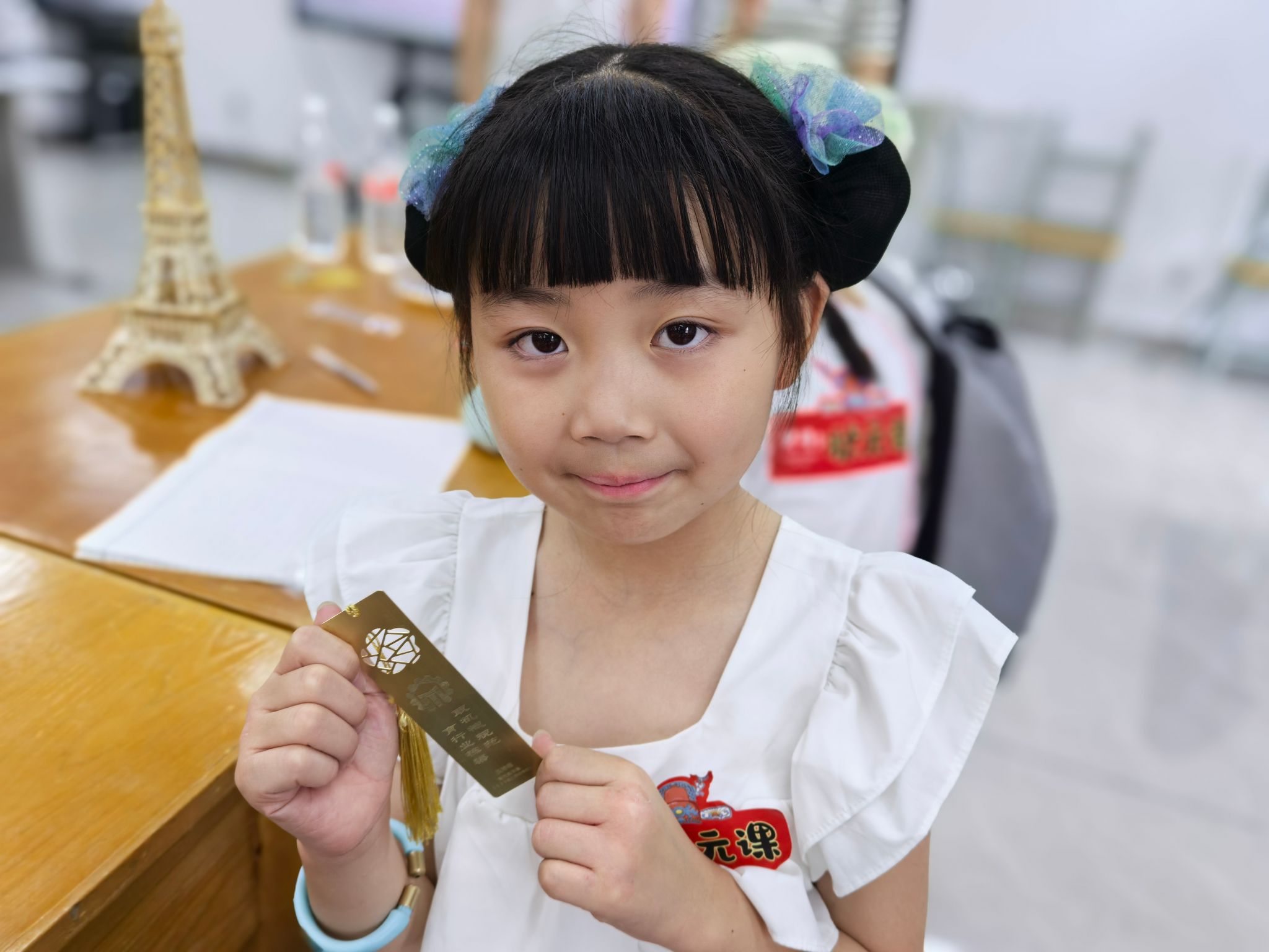 在激光刻印实验室,光纤激光雕刻机的神奇功能让孩子们大开眼界。实验室负责人闫向阳老师现场演示了激光刻蚀的全过程,孩子们目睹一块普通的亚克力板在激光的雕琢下,逐渐呈现出精美的图案。实践团成员通过软件操作,为每个孩子定制了刻有自己名字的专属书签,让他们亲身体验科技与创意的完美融合。通过展示丰富多样的刻印效果,孩子们不仅感受到了现代制造技术的魅力,更被深深激发起对科技探索的兴趣。