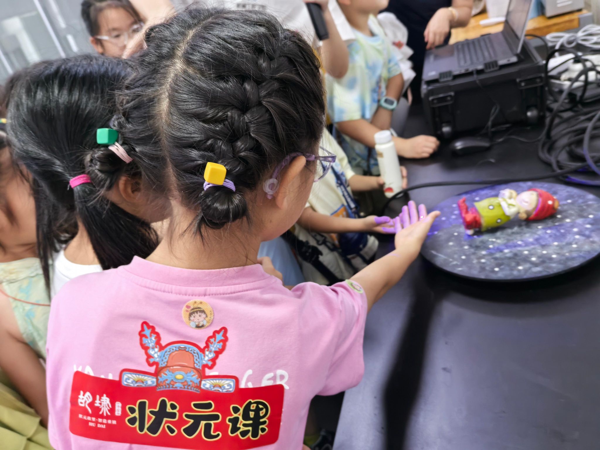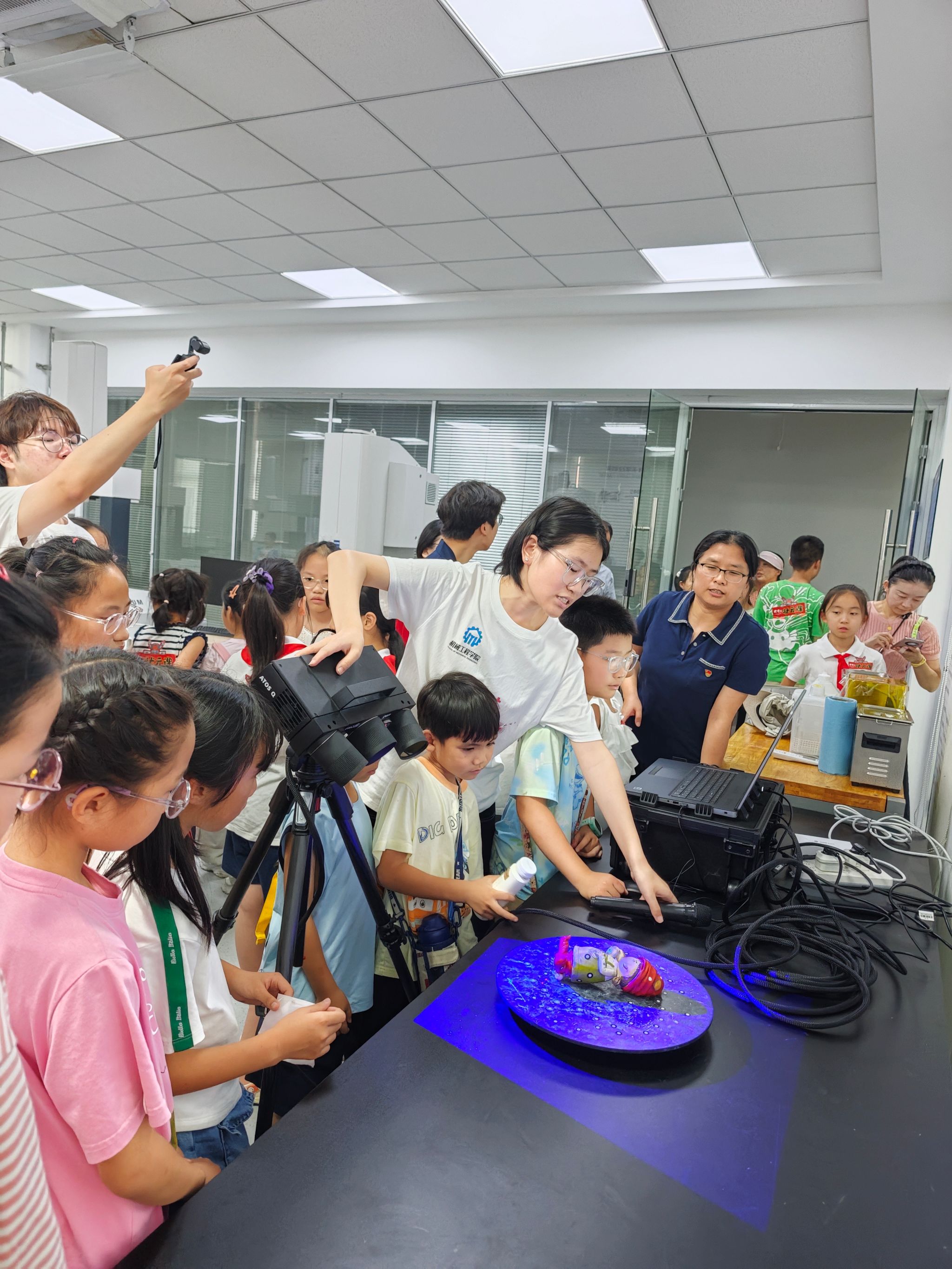 江苏高校“青蓝工程”中青年学术带头人苗盈博士在三坐标测量实验室,为孩子们开启了一场蓝光三维扫描技术科普。在实践团成员的悉心保障下,小朋友们亲手操作高精度蓝光三维扫描设备,他们共同选定一个模型玩偶作为扫描对象,屏息凝视着无形的蓝光在物体表面游走,瞬间捕捉其每一处精微轮廓。紧接着,孩子们全程见证了奇迹的发生:实物玩偶的海量空间数据被精确采集,并在专业测量软件中飞速重构,一个包含所有丰富细节的逼真三维数字模型跃然屏上。这场直观、神奇的“实物变数字”体验,将抽象的工业测量技术具象为指尖可触的魔法,在孩子们心中悄然播下了先进制造认知的种子。