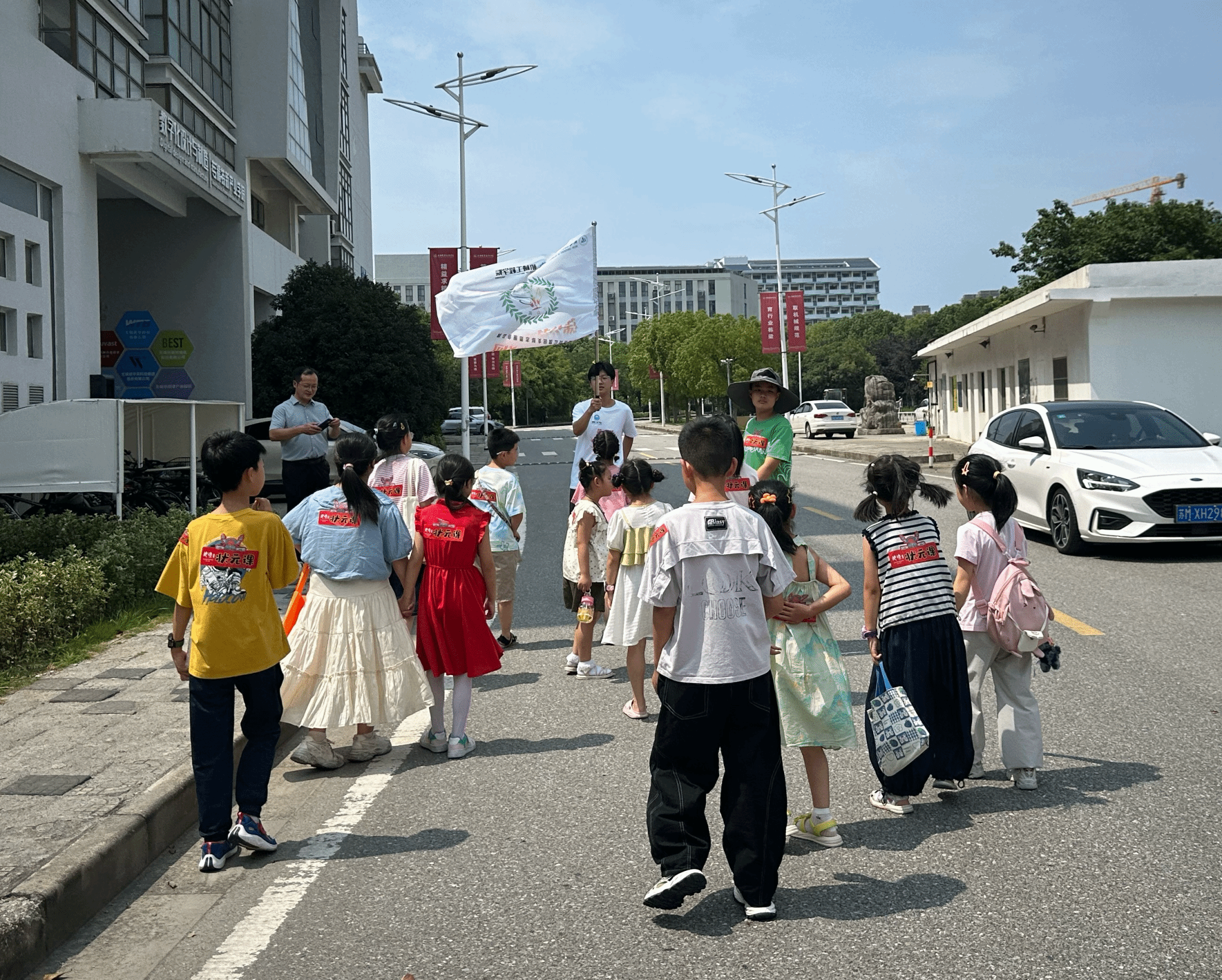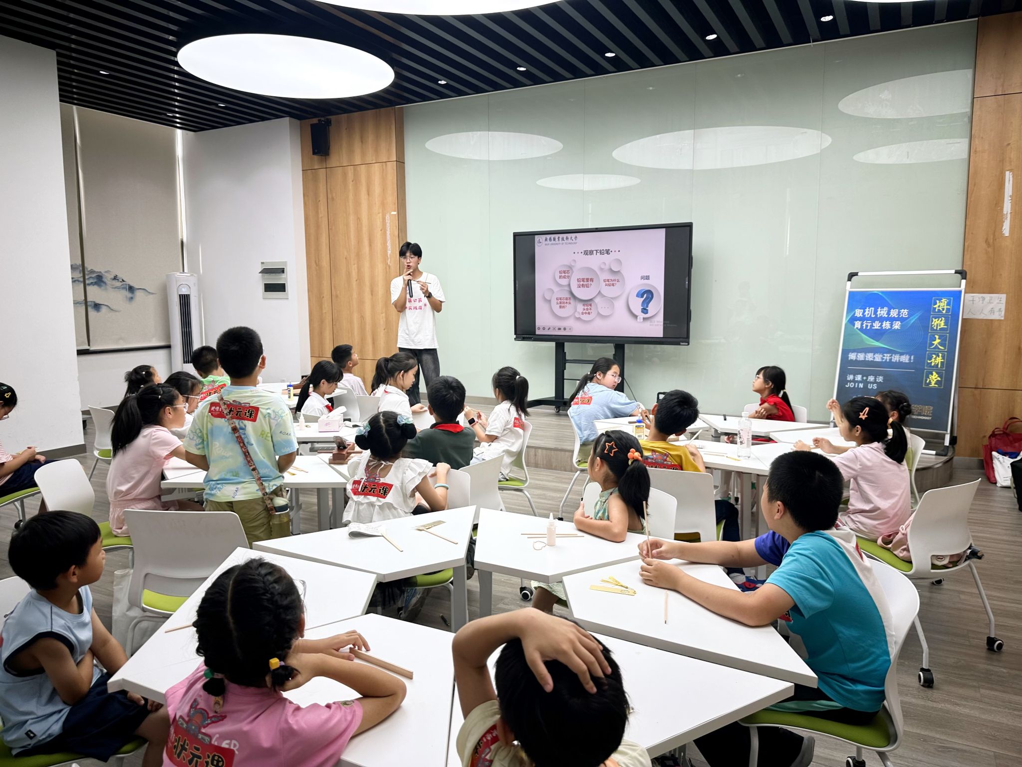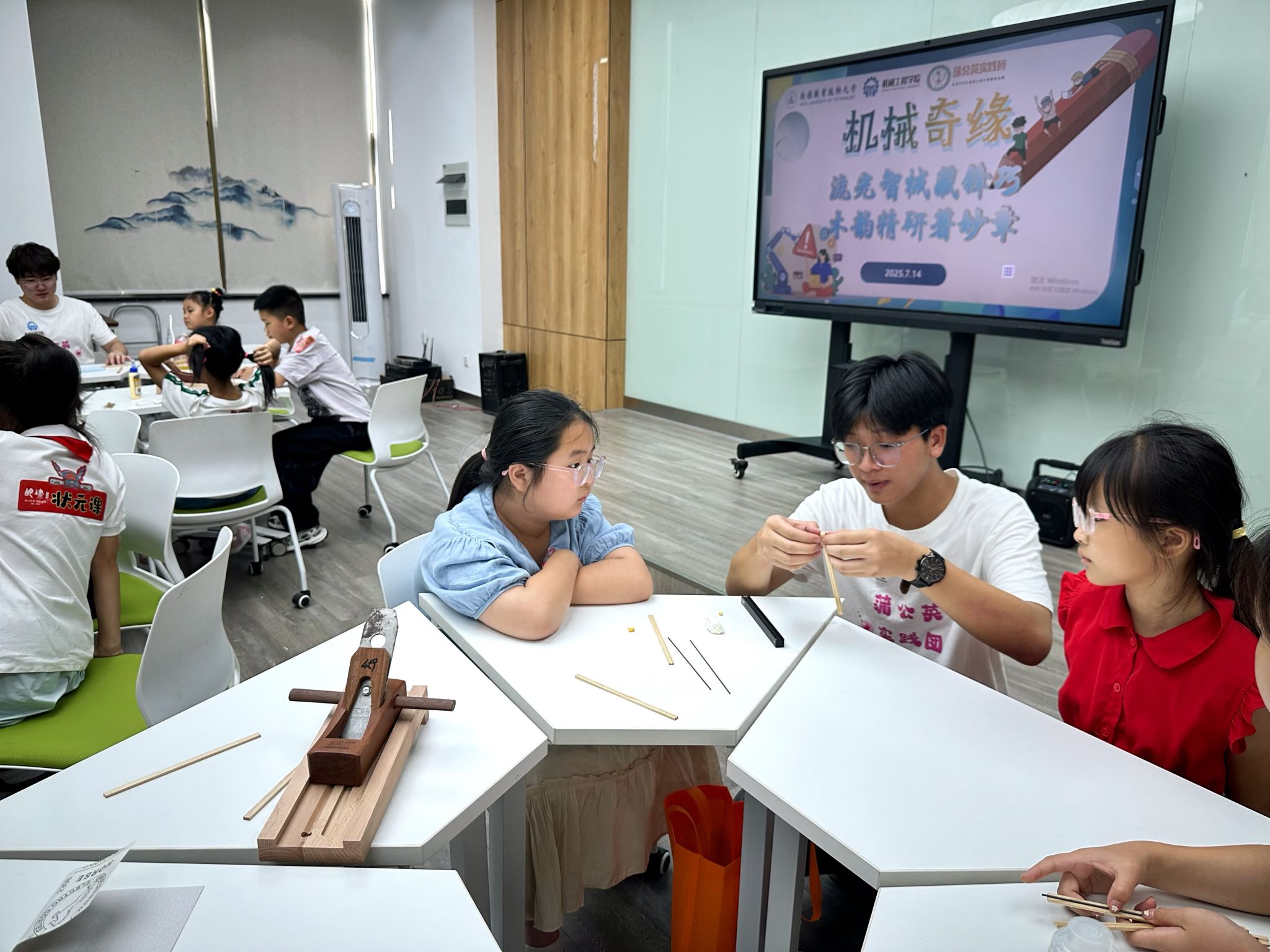 为推动科技教育与劳动实践深度融合,助力乡村青少年拓宽视野、提升素养,7月14日,机械工程学院“蒲公英”实践团组织胡埭镇新时代文明实践中心31名小学生走进大学校园,开展“流光智械藏锋巧,木韵精研著妙章”机械奇缘主题研学活动。实践团依托学院顶尖实验室资源,将深奥的工程技术转化为沉浸式体验课堂,为青少年开启了一场贯穿智造、高精、安全、艺术与劳动的“科普创想五重奏”。