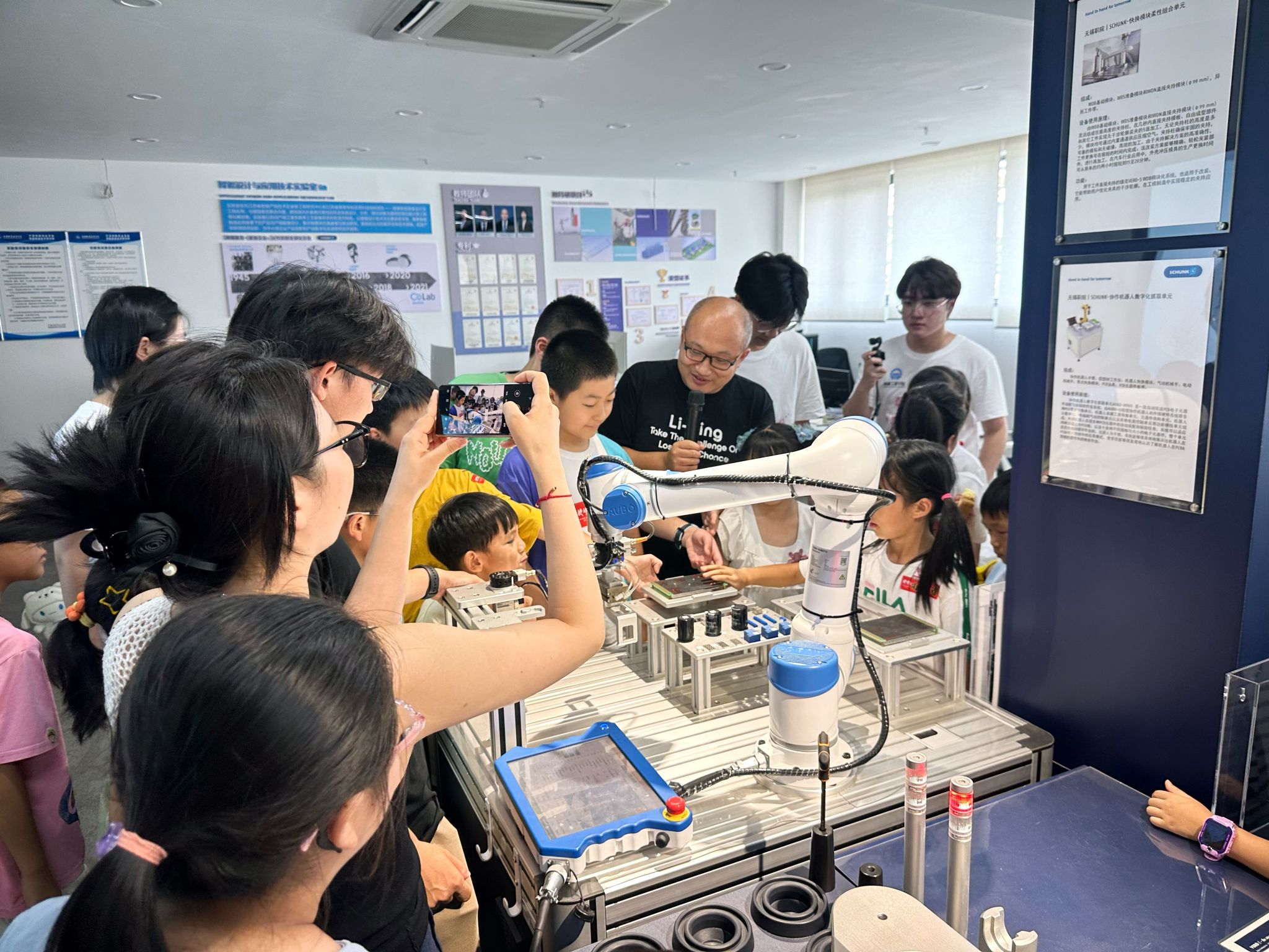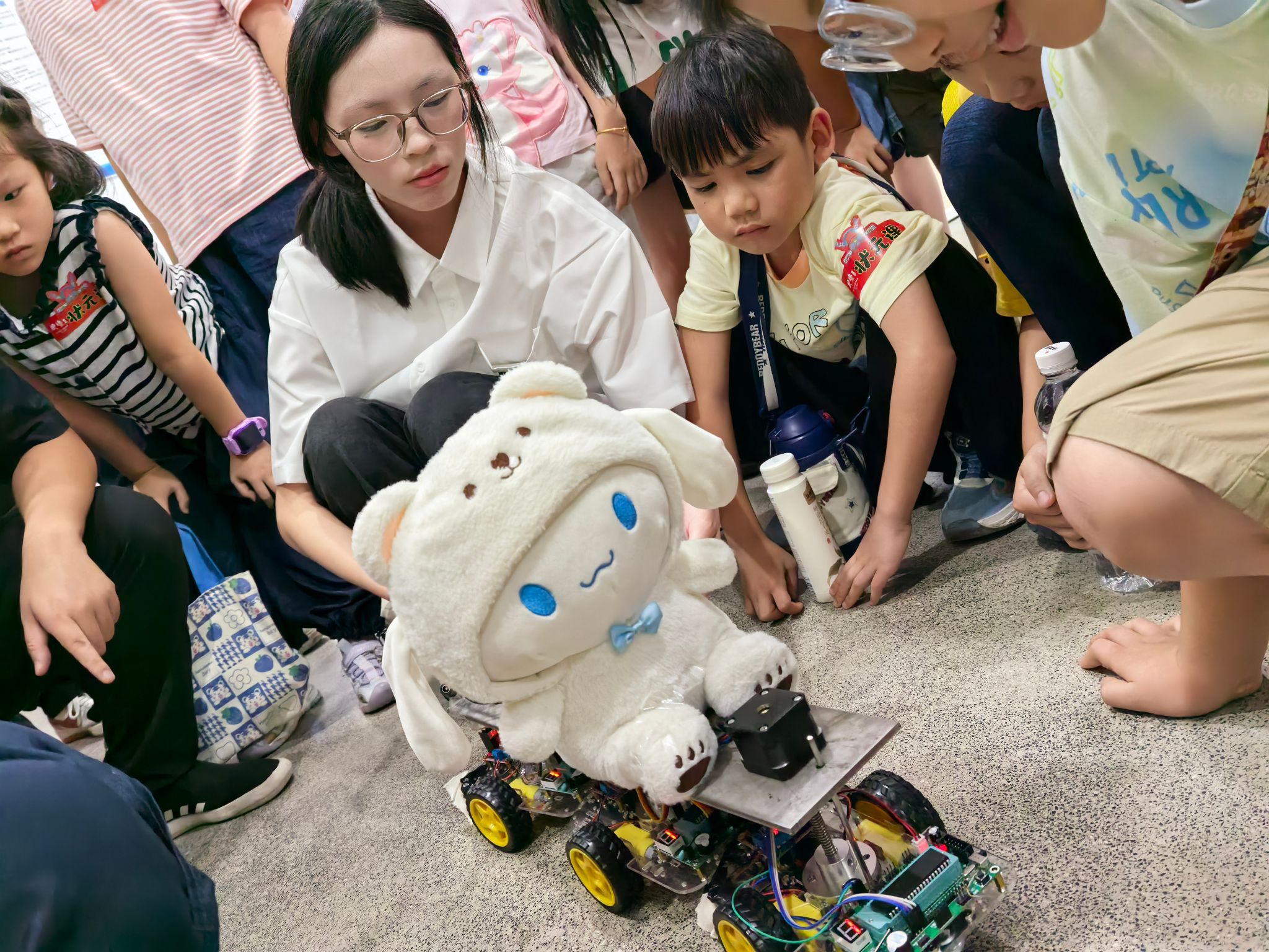 实践团带领小学生们走进智能工装实验室,开启科技探索。协作机器人抓取单元率先登场,在江苏省科技副总项目迟圣威博士的操作下,精准高效地完成着PCB元器件的自动化装配与拆卸,让孩子们直观感受到现代工业的硬核实力。孩子们屏息凝神,观察着机械臂的灵活舞动,惊叹于数字制造的精密。随后亮相的“童梦护航”智能清洁骑行小车,则展现了科技的温情面。这款专为婴幼儿家庭设计的小车,巧妙融合清洁与骑行乐趣:孩子骑行玩耍时,小车同步清洁地面,既保持家居整洁,又带来欢乐互动,生动诠释了科技服务的温度。