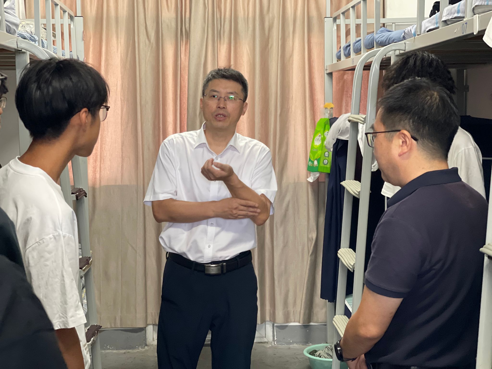 走访中,奚茂龙与2025级新生们进行了亲切的交流,细致询问他们入学后的学习生活适应情况,耐心解答新生关于学业规划、校园生活的疑问。他鼓励同学们要尽快转变角色,养成自律自省的学习和生活习惯,尽快树立个人成长目标,既要扎实掌握专业知识、勤练技术技能,也要积极参与社会实践与创新创业活动,为未来发展筑牢根基。同时他还鼓励大家要珍惜大学时光,在探索专业深度的同时,主动融入集体,涵养责任意识与人文情怀,希望同学们积极参与校园文体活动,丰富业余生活,锤炼健康体魄。