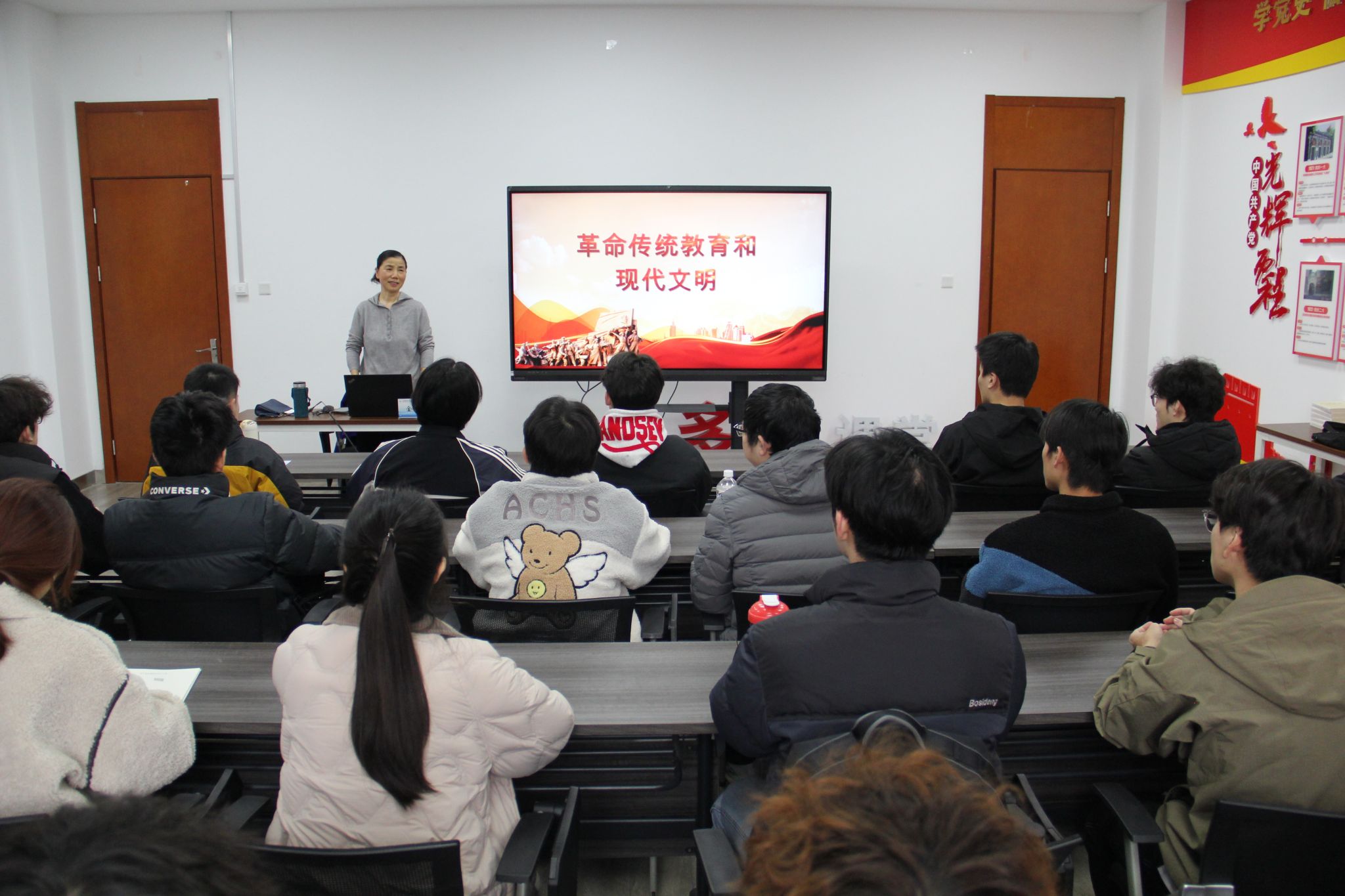 活动伊始,金湘虹以国家公祭日为契机,围绕“革命传统教育与现代文明”主题讲授专题党课。她详细讲述了南京大屠杀中日寇的滔天罪行,带领学生重温那段山河破碎的苦难历史;同时聚焦抗日战争时期全民族抗战统一战线的形成,重点分享了少数民族同胞投身抗战的英雄事迹,让同学们深刻认识到民族团结是抵御外侮的坚强基石,鼓励大家铭记历史、珍爱和平,自觉铸牢中华民族共同体意识。
