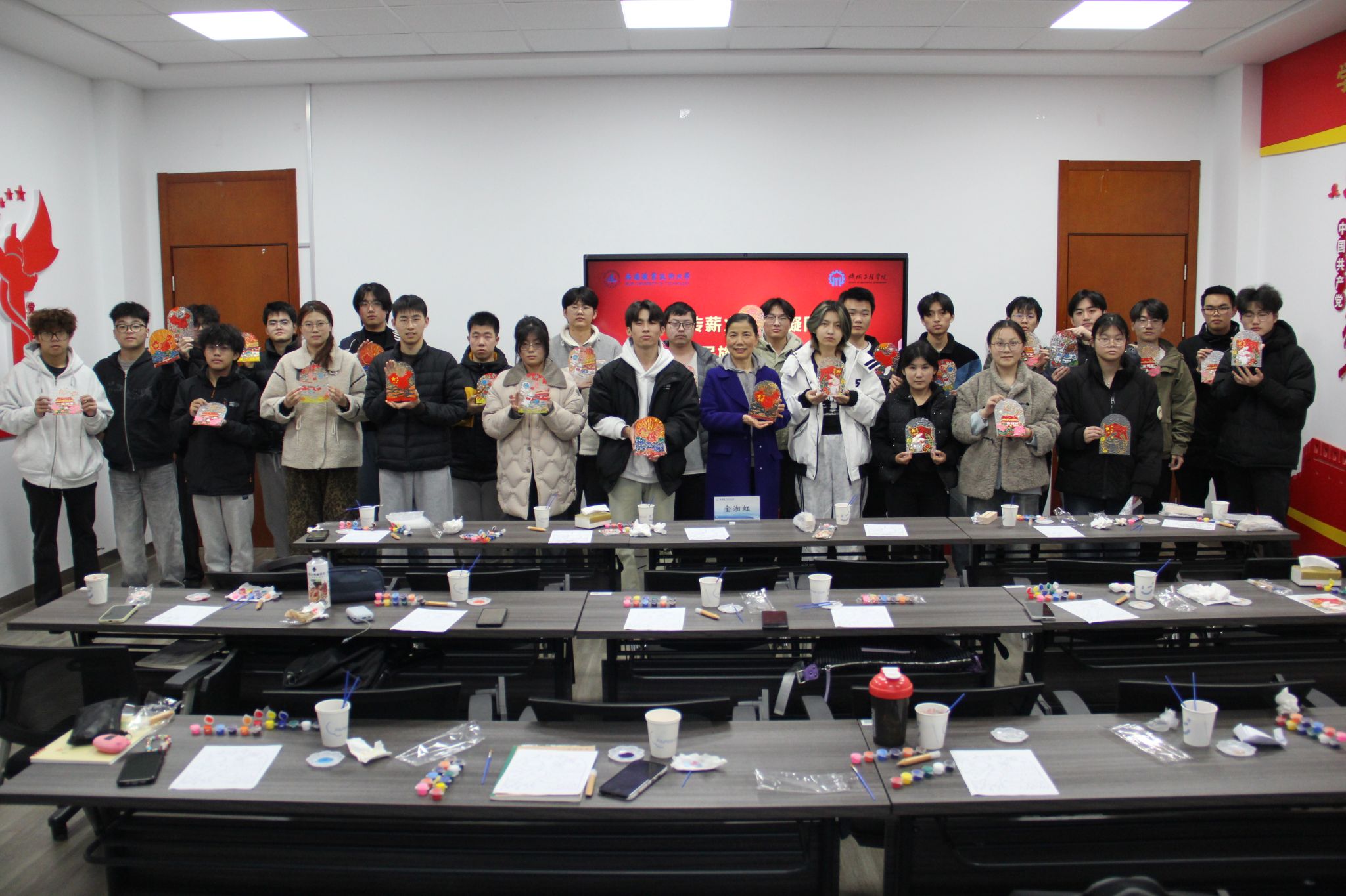 党课结束后,多民族同学们分组协作,共同制作爱国主题手绘小夜灯。大家拿起画笔,将国旗、天安门、神舟飞船等元素融入创作,在一笔一画的勾勒与色彩搭配中交流想法、互助配合。手工制作过程不仅提升了同学们的审美素养与动手能力,更让不同民族的青年学子在协作中加深情谊,进一步强化了团结一心的集体意识。