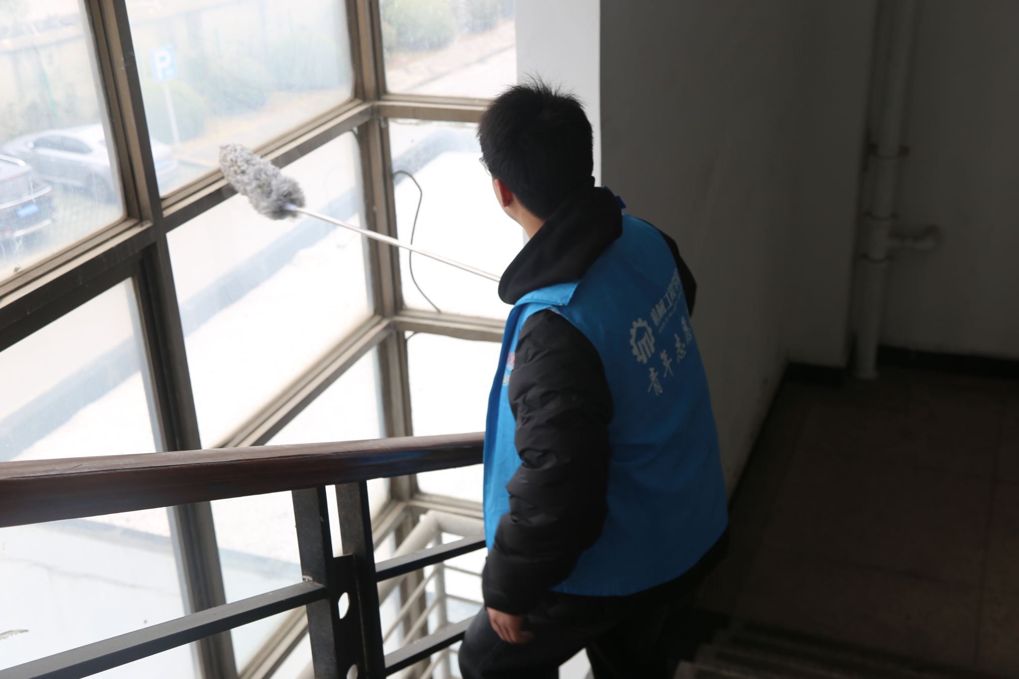 除设施安全排查外,志愿者们还重点对楼宇隐藏角落开展卫生清扫与安全排查双重行动。针对楼梯间拐角、走廊尽头、实验室储物柜后方、教室后门角落等易被忽视的区域,志愿者们手持清扫工具,认真清理垃圾、杂物,擦拭墙面污渍,同时仔细排查这些隐秘区域是否存在线路裸露、杂物堆积、墙体脱落等安全隐患,做到“清扫一处、排查一处、安全一处”。
