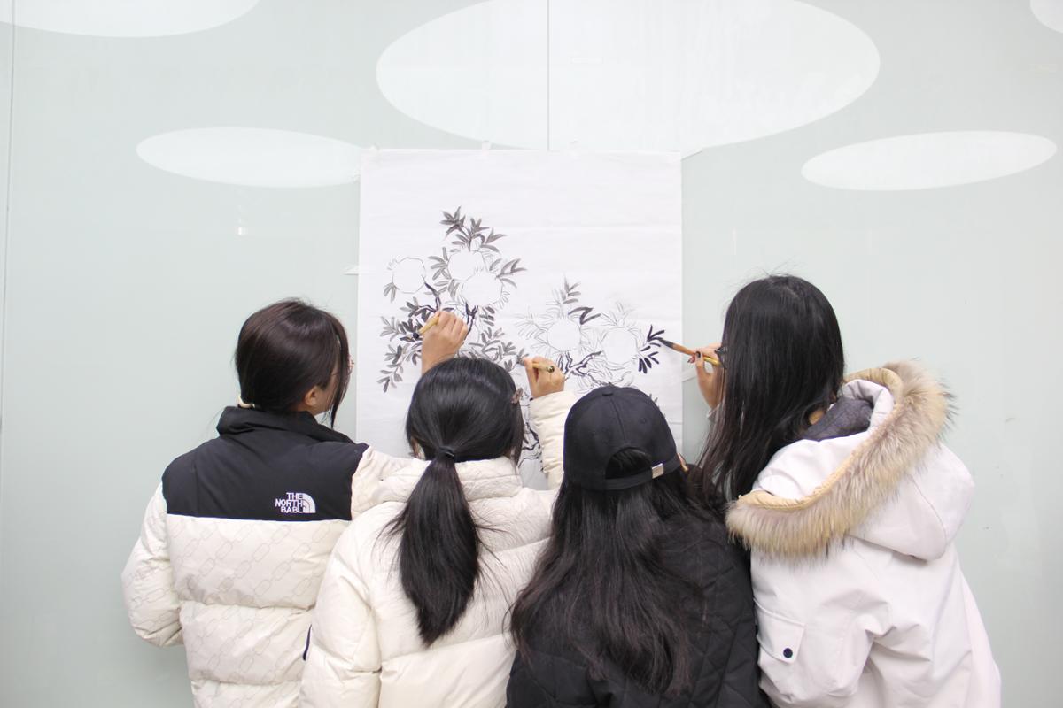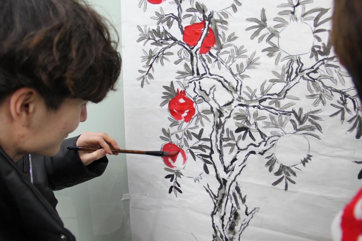 绘制环节,各民族师生共同执笔绘就水墨石榴树。大家分工协作、默契配合,以坚实的笔触勾勒出石榴树粗壮的树干,象征着民族团结坚不可摧的稳固根基;维吾尔族、哈萨克族等少数民族同学将民族文化特色融入创作,或以细腻线条描绘繁茂枝叶,或以鲜明色彩渲染饱满石榴果,汉族同学则在旁积极配合,相互交流绘画技巧,彼此提供创意灵感。现场氛围热烈而和谐,历时一小时,两幅《水墨石榴树》跃然纸上,石榴籽紧紧相拥的模样,正是各民族师生手足相亲、守望相助的生动写照。