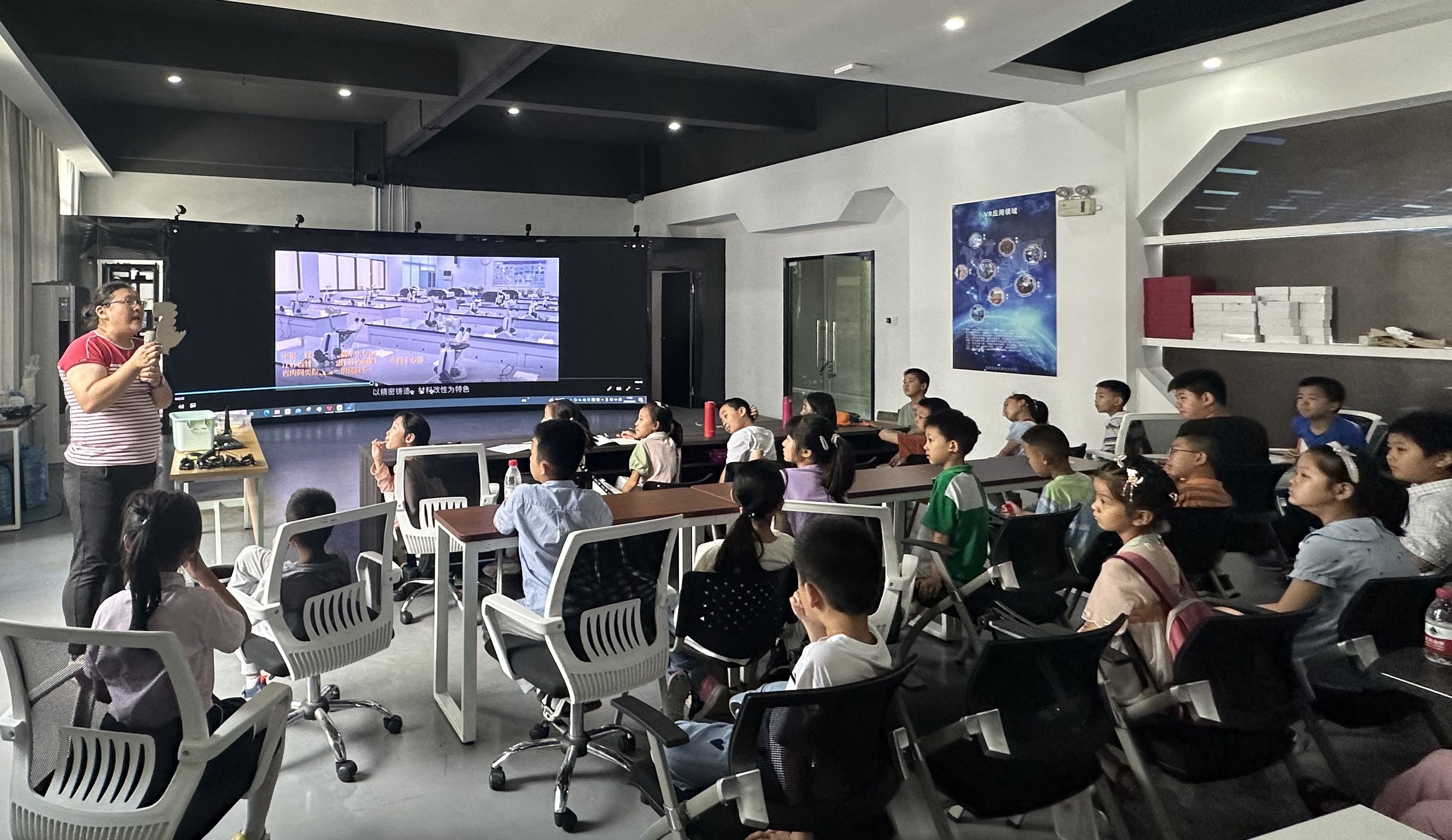 趣味科普课堂上,周丽老师带领同学们了解了学院增材制造、精密铸造、智能装备、工业视觉等实验室建设情况。职业体验课堂上,机电一体化技术专业主任唐霞老师带领创新团队学生成员,为同学们介绍了冬奥会飞扬火炬外壳打磨的科技,展示了自动导引小车运作、机械臂取材、数字模型和真实设备同步运行,让同学们了解了火炬打磨系统的出库、打磨、入库的全流程,同学们畅游在乐趣丰富的科技活动之中,感知科技的魅力。党史学习教育课堂上,学生第一党支部“红色讲解员”通过讲述建党与红船故事、播放视频“红色的故事”、红船手工制作等环节,推动学生党员当好“红船精神”的坚定捍卫者、忠实传承者、自觉践行者,在创新、奋斗、服务中学习实践中国共产党的建党精神,引导青少年听党话、感党恩、跟党走,树立理想,增长本领,立志成为社会主义建设者和接班人。