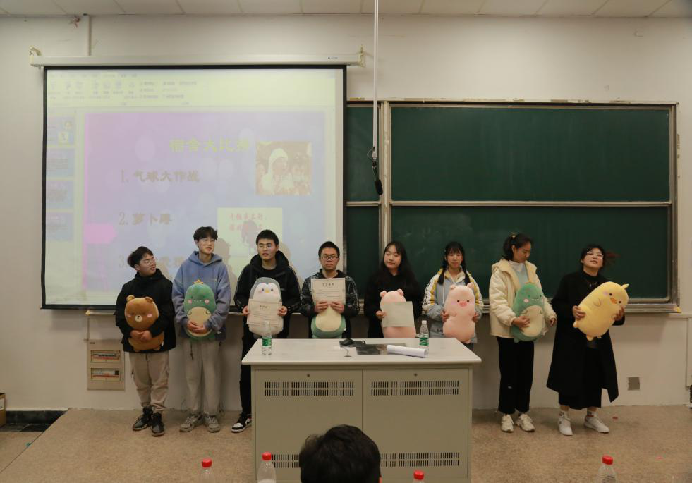 同学们发挥自身想象,围绕学习生活和宿舍文化,展示了温馨的宿舍环境和积极向上的精神风貌。经过15天的准备,12月5日,在J9-101和102教室,各参赛宿舍代表充分展示设计成果,同学们纷纷发言,向评委讲述宿舍独特的装扮方式与设计理念,展示不一样的青春色彩。中场“接龙”环节,团队合作小游戏迅速点燃了现场同学的热情。同学们通过气球大作战、你划我猜等考验默契的游戏,相互配合,让室友之间更加熟悉,亲密感和默契度进一步提升。最后,同学们积极发言,表达了通过宿舍设计带来的感悟。